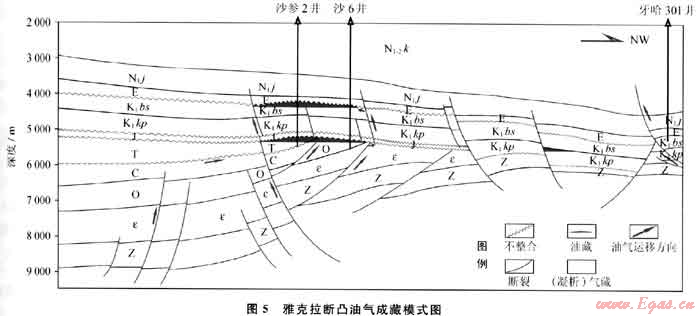 下白堊統(tǒng)沉積后,在下伏古生界侵蝕斷塊殘丘控制下,經(jīng)燕山晚期-喜山早期運動改造形成背斜圈閉,該區(qū)及臨區(qū)古生界烴源巖在海西晚期-燕山晚期成熟的油氣沿不整合面?zhèn)认蜻\移,聚集于當時區(qū)域構(gòu)造高部位——雅克拉斷凸帶;而燕山晚期輪臺斷裂的逆沖活動使油氣能夠繼續(xù)向上運移至白堊系圈閉,但由于當時缺乏封蓋條件,油氣全部逸散,僅殘存少量瀝青。