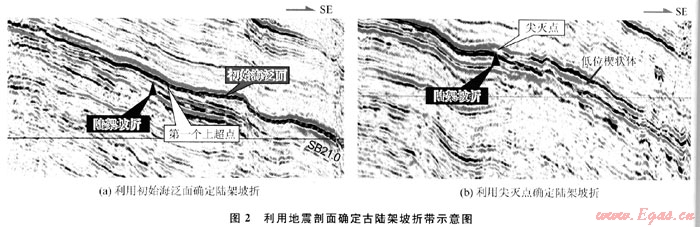 陸架坡折帶地形較為復雜,所以,確定陸架坡折點和范圍的方法非常重要。陸架坡折點為陸架最外緣坡度開始明顯變化的點,它位于陸架與陸坡之間過渡帶的向陸點。古陸架坡折點的識別則更加困難,主要依賴于地震資料,是在確定了層序邊界的基礎上進行的。可分為以下2種類型加以識別。