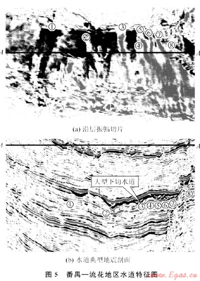 該區(qū)目前無鉆井鉆遇到該地質體,但在該區(qū)東部,其水下水道的地震特征非常明顯:利用最新采集的3D地震資料,以精細的3D地震資料做基礎,能夠清晰地觀察到水道的侵蝕、平面分布等特征。通過分析,發(fā)現(xiàn)了8條水道(圖5中①~⑧),自西向東依次排列,由北向南延伸,隨著坡度的逐漸減緩,在河道下方分別演化為扇狀朵體,并相互疊置(圖5-a)。這些水道在不同位置,其形態(tài)、寬度、長度都不同,但具有相似的地震相特征:地震同相軸呈點、段式反射,下切特征明顯,振幅中等-高(圖5-b)。通過這些水道下切形態(tài)、深度、地震反射特征和沉積厚度,可推測其形成于同一時期,且物源均來自于正北方向。