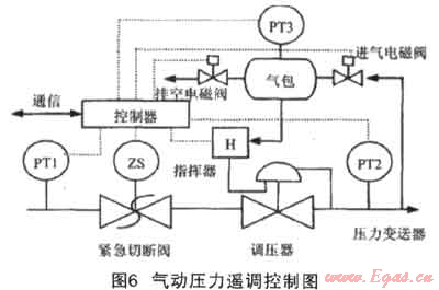 CS壓力遙調(diào)通過導(dǎo)壓管引入外部壓力,通過控制一個氣包的進、出口電磁閥來調(diào)節(jié)氣包內(nèi)的壓力,進而可以控制指揮器噴嘴噴出的燃?xì)鈮毫?,最終控制調(diào)壓器的出口壓力,如圖6[2]。
