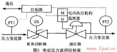 電動執(zhí)行機構(gòu)直接控制方案,如圖5,即在指揮器的調(diào)節(jié)螺桿上安裝電動執(zhí)行機構(gòu),模擬人工手動調(diào)節(jié)指揮器的調(diào)節(jié)螺桿產(chǎn)生的動作,即可達到遙控設(shè)定調(diào)壓器的出口壓力值[2]。