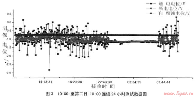 為了全面掌握雜散電流干擾和電位變化波動(dòng)情況,利用陰極保護(hù)電位遠(yuǎn)傳監(jiān)測系統(tǒng)對該次高壓管道進(jìn)行24小時(shí)連續(xù)監(jiān)測,時(shí)間選取為:10:30至第二天的10:30,測試內(nèi)容為:管道的自然電位、通電電位、斷電電位,數(shù)據(jù)采集時(shí)間間隔為5秒,土壤環(huán)境為干燥,陰極保護(hù)系統(tǒng)運(yùn)行正常。測試數(shù)據(jù)圖如圖3所示。