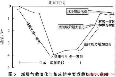 煤層氣成藏演化伴隨著煤層的沉積、埋藏變質(zhì)和抬升的演化過程。我國除變質(zhì)程度較低的含煤盆地外,絕大多數(shù)含煤盆地都經(jīng)歷了沉降和回返抬升演化階段,有的盆地甚至經(jīng)歷了多次的旋回。煤層的埋藏-抬升決定了煤層氣的成藏演化經(jīng)歷生成和吸附、吸附能力增加和解吸、擴(kuò)散、保存階段(圖5)。保存條件是控制現(xiàn)今煤層氣富集的關(guān)鍵,現(xiàn)今煤層氣藏的形成取決于構(gòu)造控藏關(guān)鍵時刻。這一關(guān)鍵時刻不等同于常規(guī)天然氣成藏的關(guān)鍵時刻,它是指地質(zhì)歷史時期煤層生烴終止后具有最小埋藏深度的時間。