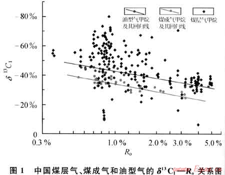 天然氣的甲烷碳同位素值主要受控于原始母質(zhì)類型和后期改造程度,煤層氣與常規(guī)天然氣碳同位素值的差異主要是由于煤層氣具有獨(dú)特的后期改造特征。常規(guī)天然氣甲烷碳同位素值主要受到母質(zhì)和烴源巖熱演化程度(Ro)的影響,相同成熟度條件的烴源巖,煤成氣比油型氣的δ13C1要重,同一母質(zhì)類型的天然氣δ13C1隨著成熟度的增加而變重(圖1);常規(guī)天然氣的后期改造,除典型生物氣外,我國已發(fā)現(xiàn)的大中型煤成氣氣藏受到生物降解的影響較小,對甲烷碳同位素值的影響不大。而煤層氣,由于氣源來自煤巖本身,甲烷碳同位素值除了受烴源巖成熟度影響外,后期的解吸作用、生物作用和水動力作用是主要的影響因素。煤層氣為吸附氣,后期吸附解吸過程中,13CH4比12CH4難解吸,從而發(fā)生同位素的分餾效應(yīng),造成同位素值的變化[32];目前工業(yè)開采利用的煤層氣藏一般埋深淺于2000m,生物降解作用使得烴源巖成熟度相近的煤層氣較常規(guī)煤成氣的甲烷碳同位素值偏輕[28,33~34];煤層氣受水動力條件影響也較大,其作用機(jī)制為甲烷通過水溶作用而改變同位素的組成[35]。