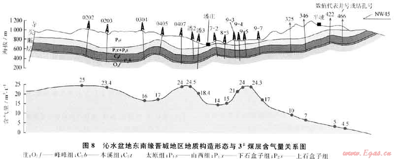 向斜一般具有地層水的向心流動機(jī)制,為地下水低勢區(qū),為滯流水環(huán)境,有利于煤層壓力和含氣量的保存;同時向斜部位上覆地層有效厚度大,維持較高的地層壓力系統(tǒng),也有利于煤層氣的吸附和保存。因此,向斜具有的低水勢和高壓場特征,成為煤層氣富集的場所(圖9)。