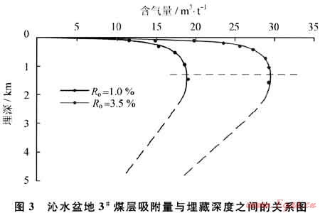 因此,影響煤層吸附能力的主要因素是煤階、溫度和壓力。在正常地溫梯度下,埋深1500m以淺的煤層吸附能力主要受壓力控制,在這個深度范圍煤層吸附能力達(dá)到最大值之后隨著埋深加大含氣量具有降低的趨勢(圖3)[39]。因此,煤層含氣量主要受到溫度壓力場的控制。
