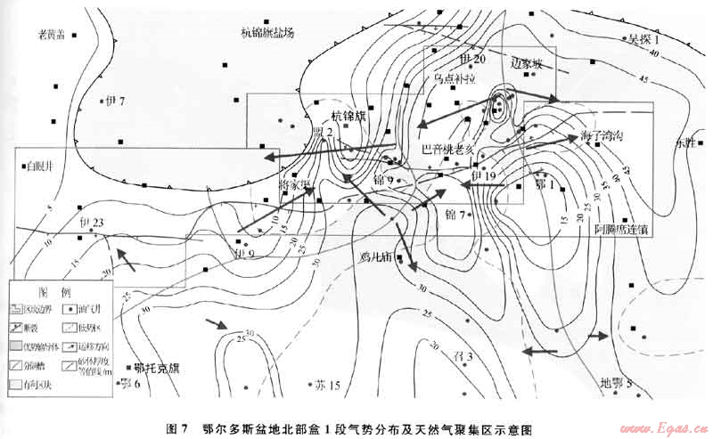 常規(guī)油氣圈閉機(jī)制是在儲層中有被油氣高等勢面封閉形成的油氣低勢區(qū),這種低勢區(qū)是一個孔隙、滲透性巖體,是聚集、保存油氣的場所,位置具有明顯的可預(yù)測性。這說明,常規(guī)油氣的聚集取決于油氣勢的太小,高部位一般具有低油氣勢,是油氣運(yùn)移的指向,目此,常規(guī)油氣主要聚集于背斜構(gòu)造。常規(guī)天然氣在運(yùn)移過程中主要受浮力、毛細(xì)管力和地層水的水動力3種作用力的共同控制。天然氣在地層中不同位置的勢能不同,由于氣勢梯度的存在,天然氣會沿著氣勢減』、的最大方向(負(fù)氣勢梯度方向)從高氣勢區(qū)向低氣勢區(qū)運(yùn)移(圖6)。運(yùn)移的結(jié)果是天然氣進(jìn)入自身勢能最1、的區(qū)域后不再發(fā)生運(yùn)移,達(dá)到平衡狀態(tài)后聚集成藏。如通過對鄂爾多斯盆地北部二疊系石盒子組盒1段氣勢的分析發(fā)現(xiàn),天然氣聚集區(qū)主要發(fā)育于低氣勢區(qū)(圖7)。