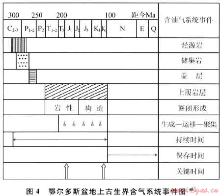 常規(guī)天然氣的成藏演化過程一般經(jīng)歷3個階段:生成階段、運(yùn)移和聚集階段、保存和破壞階段。氣藏演化不一定經(jīng)歷晚期抬升過程,烴源巖、儲層和蓋層等靜態(tài)要素和天然氣生成、運(yùn)移、圈閉形成和成藏等過程的動態(tài)地質(zhì)作用的最佳時空匹配是其成藏的關(guān)鍵。如鄂爾多斯盆地上古生界天然氣成藏要素及地質(zhì)作用的最佳匹配時間(關(guān)鍵時刻)是早侏羅世和晚白堊世[40](圖4)。