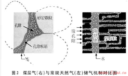 常規(guī)天然氣儲層主要發(fā)育于烴源巖圍巖中,具有明顯的生儲蓋縱向組合,而煤層氣的儲層就是煤層本身,從而造就了兩者在儲集機(jī)理和氣藏特征上的差異。