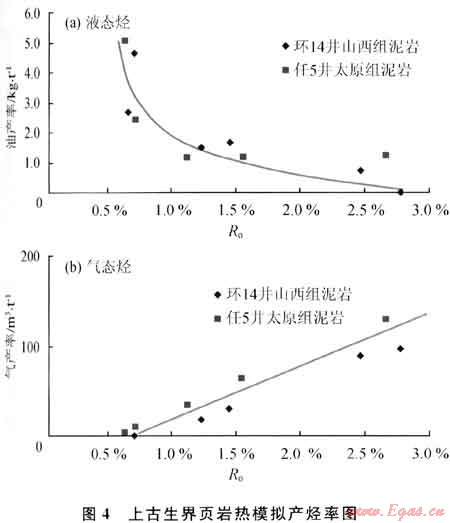 鄂爾多斯盆地環(huán)14井山西組頁巖和任5井太原組頁巖的熱模擬實(shí)驗結(jié)果表明(圖4):Ro<0.7%時,幾乎沒有氣態(tài)烴產(chǎn)出;Ro介于0.7%~1.1%時,液態(tài)烴產(chǎn)率隨Ro增大迅速下降,而氣態(tài)烴產(chǎn)率則迅速增大,但產(chǎn)率數(shù)值還很?。籖o>1.1%時,液態(tài)烴產(chǎn)率隨Ro增大緩慢下降,而氣態(tài)烴產(chǎn)率隨R,增大迅速增大;Ro為2.5%時的氣態(tài)烴產(chǎn)率達(dá)到110m3/t(有機(jī)碳)。從該區(qū)上古生界頁巖的Ro大都超過1.1%可見,上古生界頁巖以生成氣態(tài)烴為主,僅有少量液態(tài)烴。
