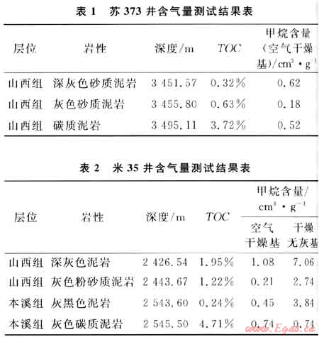 含氣量是評價頁巖含氣性的最重要指標(biāo)。由于頁巖氣勘探在鄂爾多斯盆地尚處于探索階段,在石炭-二疊系泥頁巖段很難設(shè)計取心,因此2010年筆者在蘇373和米35井砂巖段的取心過程中,挑選了其中夾持的泥頁巖段進(jìn)行含氣量分析,雖然不能完全代表石炭-二疊系泥頁巖段的真實(shí)含氣量,但也具有一定的參考價值。
