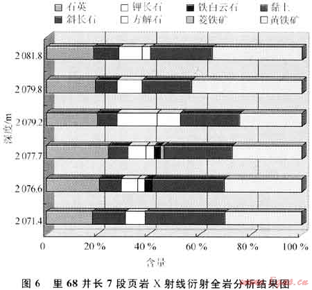 長7段野外露頭樣品脆性礦物石英與斜長石含量高,黏土含量低。位于陜西省銅川市金鎖關(guān)鎮(zhèn)何家坊的長7段黑色頁巖X射線衍射全巖分析結(jié)果顯示:石英含量為42.92%~47.18%,斜長石含量為5.52%~9.06%,鉀長石含量為6.07%~18.06%,黏土含量為24.41%~31.01%,方解石、鐵白云石、菱鐵礦含量沒有或很少。宜川三里灣露頭樣品石英含量比銅川金鎖關(guān)鎮(zhèn)何家坊野外露頭樣品低,但斜長石含量要高得多,脆性礦物石英加斜長石含量相當(dāng),黏土含量也較低。里68井的巖心分析資料表明:石英含量為17.00%~23.O0%,斜長石含量為5.O0%~10.00%,鉀長石含量為6.00%~15.00%,黏土含量為20.00%~30.O0%,方解石、鐵白云石、菱鐵礦含量沒有或較少(圖6)。巖心樣品除石英含量偏低外,其余礦物含量與露頭樣品接近。