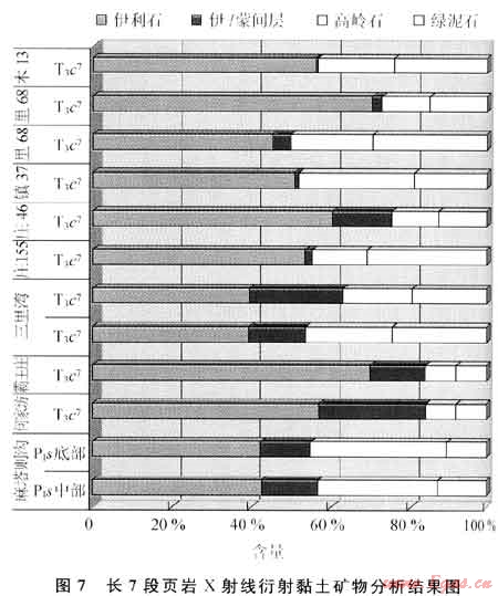 長7段頁巖分布穩(wěn)定,可對比性強(qiáng)。巖心樣品X射線衍射黏土礦物分析結(jié)果顯示:伊利石含量為38.05%~66.10%,伊/蒙間層含量為1.O0%~25.00%,高嶺石含量為5.15%~27.03%,綠泥石含量為7.18%~32.37%(圖7)。巖心及野外露頭觀察表明,長7段頁巖外觀呈黑色,質(zhì)純,偶見介形蟲、魚類化石及星點(diǎn)狀黃鐵礦,并可見到泥包砂等深水沉積構(gòu)造,深湖-半深湖相沉積特征明顯。同時,頁巖段中普遍夾有薄層凝灰?guī)r和砂質(zhì)頁巖,反映了湖盆的輕微震蕩和古氣候環(huán)境的變化。