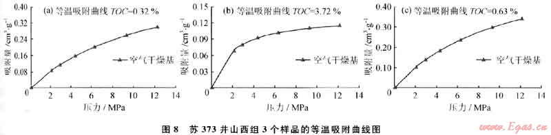 分析蘇373井3個樣品的等溫吸附曲線(圖8)可知:砂質(zhì)泥巖比碳質(zhì)泥巖的甲烷吸附能力強(qiáng),而同種巖性,TOC與甲烷吸附能力成正比,如T0C為0.6 3%的樣品在壓力為6MPa時,甲烷吸附能力為0.23g/cm3,壓力增加到12MPa時,甲烷吸附能力增至0.34g/cm3。