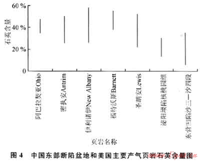 與美國主要產(chǎn)頁巖氣盆地類比,中國陸相頁巖具有分布局限、埋藏普遍較深、脆性礦物含量低、黏土含量高(圖4),具有成藏機(jī)理和成藏條件特殊以及不利于后期改造等不利因素,需要在今后的工作中,加強(qiáng)陸相頁巖油氣地質(zhì)理論和開采技術(shù)的研究。