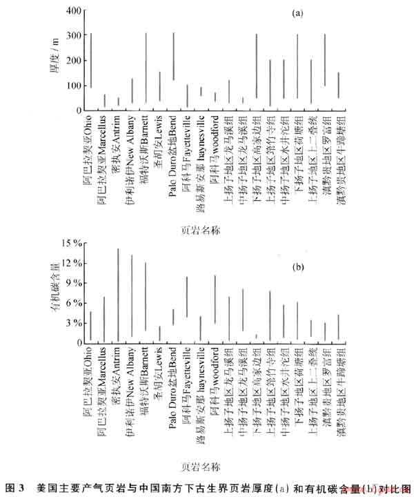 筆者對四川盆地及其周緣重慶市秀山縣溶溪鎮(zhèn)等16塊樣品分析,有機(jī)碳含量分布在0.28%~6.37%,平均為2.44%,普遍大于1%(其中大于1%的樣品數(shù)占樣品總數(shù)的80%,大于2%的樣品數(shù)占樣品總數(shù)的53.3%),這些均表明下寒武統(tǒng)黑色頁巖的有機(jī)碳含量高。中揚(yáng)子、下?lián)P子等地的古生界烴源巖也均具有厚度大、有機(jī)碳含量高等優(yōu)點(diǎn),可與美國主要產(chǎn)氣頁巖盆地進(jìn)行對比(圖3)。