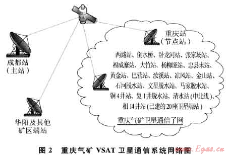 3) 對(duì)于新納入到重慶輸氣管網(wǎng)SCADA系統(tǒng)進(jìn)行監(jiān)控的站場(如地處偏遠(yuǎn)且公網(wǎng)難以到達(dá)的重要站場)采用VSAT衛(wèi)星系統(tǒng)數(shù)據(jù)傳輸電路作為重慶輸氣管網(wǎng)SCADA系統(tǒng)數(shù)據(jù)傳輸主通道,GPRS數(shù)據(jù)傳輸作為SCADA系統(tǒng)備用數(shù)據(jù)傳輸通道。重慶氣礦VSAT衛(wèi)星通信系統(tǒng)網(wǎng)絡(luò)圖如圖2所示。