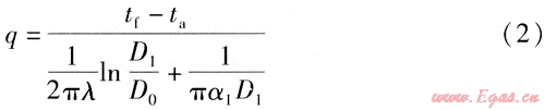 忽略管道的導熱熱阻、燃氣與管道內表面對流換熱的熱阻,得到公式(2)[4]。