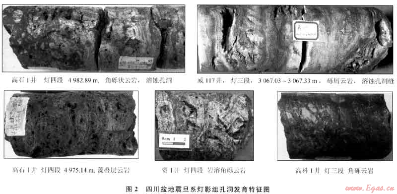 震旦系燈影組下部(燈二段)也有儲層發(fā)育。由于其埋藏較深、含水層較多,以前并未給予足夠重視,對其取得的實物資料較少,研究程度不高。從目前不多的資料來看,它和上部的儲層發(fā)育特征有所差異,主要表現(xiàn)為溶洞規(guī)模降低,孔隙層增多。巖心描述顯示:燈影組向下大型縫洞減少,小型孔洞占據(jù)優(yōu)勢,高科1井燈影組巖心統(tǒng)計,溶洞巖心累計28.57m,其中燈四段11.45m(占40.1%),燈三段12.20m(占42.7%),燈二段4.92m(占17.2%),顯示出向下溶洞發(fā)育減弱。但是在基質物性方面,下部儲層有變優(yōu)的趨勢,表明孔隙層增多,借此可以彌補溶洞層減少的不足。