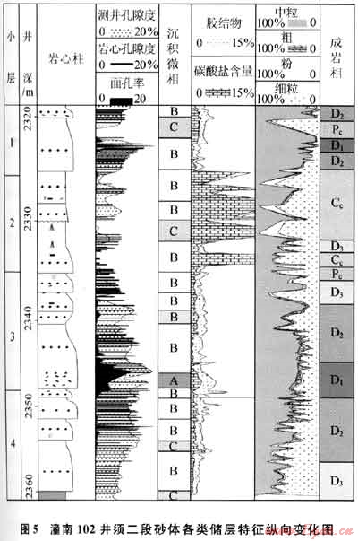 須二段大型復(fù)合砂體主要由4期河道遷移擺動(dòng)形成的砂體組成,縱向上不同時(shí)期沉積砂體之間或同期砂體內(nèi)部的沉積韻律、微相組合、膠結(jié)物類型及其含量、成巖相類型及其組合以及孔隙度和面孔率等存在明顯差異,非均質(zhì)性較強(qiáng)。圖5為潼南102井須二段復(fù)合砂體沉積微相、成巖相和孔隙度的縱向變化圖,可見河道滯留微相(A)和砂壩相砂體(B)主要由粗粒或中粒砂組成,發(fā)育強(qiáng)溶蝕成巖相(D1)和中溶蝕成巖相(D2和D3),對(duì)應(yīng)的巖心孔隙度可超過7%,而溢流砂坪相砂層(C)及其上下地層由細(xì)粒粉砂和泥巖組成,常見機(jī)械壓實(shí)致密成巖相(Pc)和碳酸鹽充填成巖相(Cc),對(duì)應(yīng)孔隙度在2%~5%,以上現(xiàn)象說明沉積微相、成巖相和儲(chǔ)層物性三者之間的關(guān)系密切,儲(chǔ)層物性明顯受沉積微相和成巖相雙重控制,其中河道粗粒砂巖原生孔隙發(fā)育,有利于各類溶蝕作用的產(chǎn)生,形成中低孔滲儲(chǔ)集體,造成儲(chǔ)層非均質(zhì)性強(qiáng)。