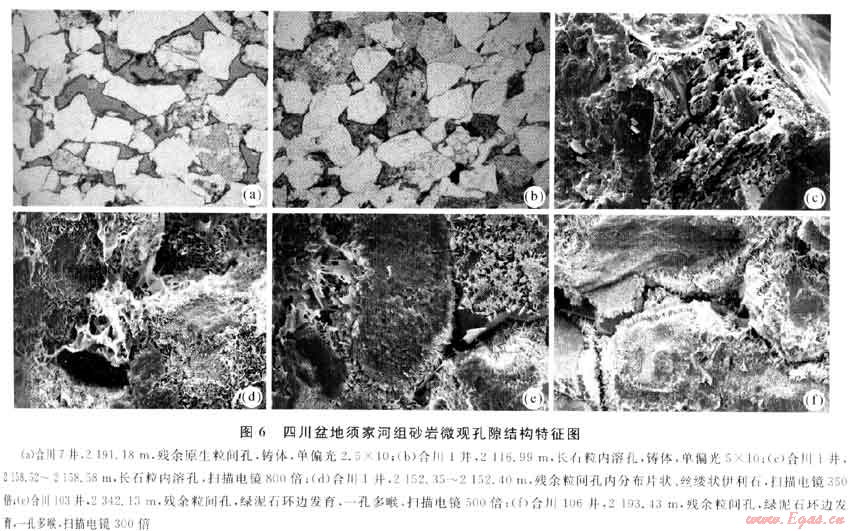 前人研究成果認(rèn)為[7,9~10],須家河組砂巖是建設(shè)性和破壞性成巖作用的綜合結(jié)果,其中壓實(shí)和膠結(jié)充填等破壞性成巖作用是導(dǎo)致砂巖大面積致密化的主要因素,而各類溶蝕作用和綠泥石襯邊等建設(shè)性成巖作用是造成致密砂巖內(nèi)中孔滲儲(chǔ)集體發(fā)育的主要因素。羅孝俊等人[13]認(rèn)為堿性長(zhǎng)石(鉀長(zhǎng)石、鈉長(zhǎng)石)在較為酸性或較為堿性介質(zhì)中均易發(fā)育次生孔隙,斜長(zhǎng)石(近鈣長(zhǎng)石)在偏堿性介質(zhì)中才易發(fā)育次生孔隙。Pittman[14]認(rèn)為等厚連續(xù)黏土包殼可以抑制碎屑石英的成核作用,能夠抑制石英次生加大作用,避免因多期石英加大造成的孔隙減少。筆者通過觀察大量須二段巖心鑄體薄片和掃描電鏡資料(圖6),發(fā)現(xiàn)殘余粒間孔或粒內(nèi)溶蝕孔隙在富含堿性長(zhǎng)石、火山巖屑和綠泥石膠結(jié)物的砂巖中相對(duì)發(fā)育,統(tǒng)計(jì)堿性長(zhǎng)石和綠泥石膠結(jié)物含量與孔隙度大小的關(guān)系,發(fā)現(xiàn)它們之間存在明顯的正相關(guān)關(guān)系,說明煤系酸性成巖環(huán)境中,堿性長(zhǎng)石和綠泥石環(huán)邊膠結(jié)物分布及其含量是引起差異溶蝕作用的根本原因,也是造成須二段砂巖儲(chǔ)集體非均性強(qiáng)弱的關(guān)鍵要素。