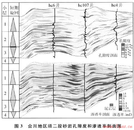 通過建立四川盆地須家河組層序地層格架(圖1),針對(duì)合川地區(qū)開展須二段砂巖精細(xì)小層對(duì)比(自上而下劃為1~4個(gè)小層)和相控隨機(jī)模擬儲(chǔ)層預(yù)測(cè)綜合研究。研究成果顯示(圖3),須二段各小層之間泥巖隔層不發(fā)育,主要發(fā)育含泥細(xì)粒粉砂質(zhì)物性隔層,其內(nèi)部大量致密砂巖分隔體(層)與中高孔滲砂體相互“滲透”和交叉分布。
