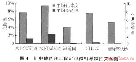 物性分析結(jié)果也顯示不同沉積微相的砂巖孔隙度和滲透率差異明顯(圖4),河道微相和砂壩相砂體與溢流砂坪相砂體相比,其平均滲透率級(jí)差可為2~3倍。利用300個(gè)巖樣滲透率分析的結(jié)果,結(jié)合前人對(duì)須二段物性分析的成果,繪制須二段滲透率平面分布圖,發(fā)現(xiàn)中高孔滲帶(孔隙度大于8%、滲透率大于0.1mD)主要沿主河道或次水道的流向分布,其中滲透率介于1~10mD的儲(chǔ)層面積約占整個(gè)砂體平面分布12%,滲透率為1~0.1mD的儲(chǔ)層面積約占整個(gè)砂體平面分布65%,滲透率為0.1~0.01mD的儲(chǔ)層面積約占整個(gè)砂體平面分布15%,滲透率小于0.01mD的儲(chǔ)層面積約占整個(gè)砂體平面分布8%,以上說明須二段儲(chǔ)層的平面非均質(zhì)性較強(qiáng)。