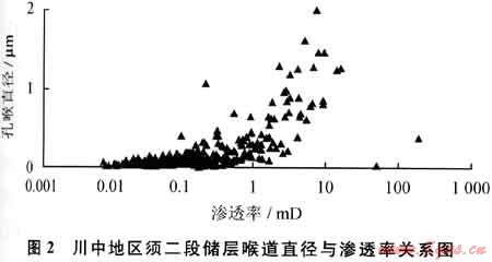川中及川中-蜀南過渡帶須二段巖石類型主要為長(zhǎng)石巖屑砂巖,含少量巖屑砂巖和長(zhǎng)石石英砂巖,石英和巖屑含量中等,長(zhǎng)石含量相對(duì)較高,分別平均為61.45%、1.97%和10.51%;其砂巖孔隙類型主要為粒間、粒內(nèi)溶孔、綠泥石襯邊的溶蝕孔和石英次生加大后的殘余粒間,以及少量雜基孔和微裂縫,面孔率約為10.73%,孔隙結(jié)構(gòu)以中孔細(xì)喉為主,局部發(fā)育小孔細(xì)喉和大孔細(xì)喉型組合。大量須二段巖心壓汞分析統(tǒng)計(jì)結(jié)果顯示(圖2),須二段砂巖的孔隙結(jié)構(gòu)非均質(zhì)性較強(qiáng),喉道直徑分布在0~2μm,變化范圍較大,其中直徑小于0.5μm的微孔喉和小孔喉體積分別占總體積的75%左右,大孔喉發(fā)育較少,并且當(dāng)孔喉直徑小于0.5μm時(shí),滲透率隨孔喉直徑變化呈指數(shù)函數(shù)增長(zhǎng),對(duì)滲透率的影響較為敏感。