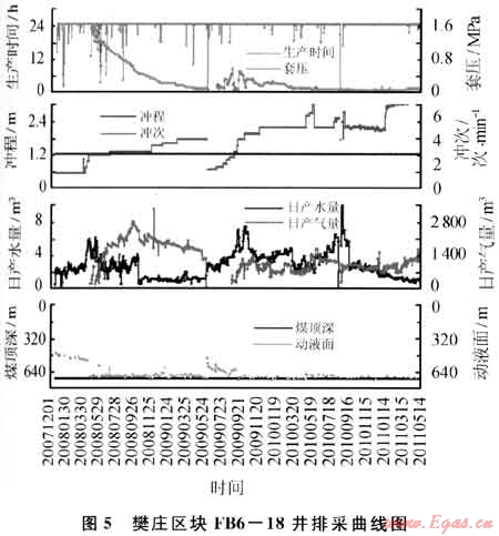 FB6-18井于2007年4月6日完鉆,完鉆井深763m。2007年7月10日壓裂3#煤層,壓裂井段702.8~707.5m,厚度4.7m,共注入活性水壓裂液460m3,石英砂40m3。2007年12月20日投產(chǎn),排采127d解吸見(jiàn)氣,最高日產(chǎn)氣量達(dá)到1555m3,產(chǎn)氣高峰時(shí)日產(chǎn)水3.5m3,維持242d后日產(chǎn)氣量迅速下降至696m3,水量1.5m3。判斷為作業(yè)導(dǎo)致煤粉堵塞,或氣鎖,導(dǎo)致難以高產(chǎn)。2009年6月4日進(jìn)行中等規(guī)模壓裂解堵,目前氣量700m3,日產(chǎn)水0.7m3。經(jīng)分析未見(jiàn)效的主要原因該井處于煤層斷層帶附近,煤體結(jié)構(gòu)破碎,煤層堵塞后,難以用壓裂方法解開(kāi)地層堵塞,只有采取連續(xù)排采,平穩(wěn)降壓的方法,進(jìn)一步擴(kuò)大解吸范圍,提高產(chǎn)氣量,隨著排采時(shí)間的增長(zhǎng),該井產(chǎn)量開(kāi)始緩慢上升(圖5)。