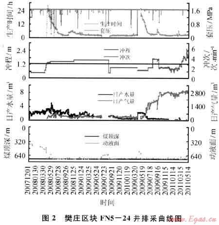 FN5-24井于2006年11月12日完鉆,完鉆井深783m。2007年4月14日壓裂3#煤層,壓裂井段721.6~727.5m,厚度5.9m,共注入活性水壓裂液551m3,石英砂45m3。2007年12月9日投產(chǎn),排采134d解吸見(jiàn)氣,最高日產(chǎn)氣量達(dá)到693m3,產(chǎn)氣高峰時(shí)日產(chǎn)水3.5m3,維持30d后日產(chǎn)氣量迅速下降至211m3,水量0.9m3。解吸初期套壓高,出現(xiàn)頻繁俜抽導(dǎo)致井底壓力波動(dòng),低產(chǎn)判斷為由于井底壓力反復(fù)波動(dòng)導(dǎo)致地層氣鎖,導(dǎo)致套壓、產(chǎn)氣量迅速下降(圖2)。2010年4月6日進(jìn)行中等規(guī)模壓裂解堵,措施后183d,產(chǎn)氣量增加至2683m3,截至目前已穩(wěn)產(chǎn)24d,累計(jì)增產(chǎn)氣40×104m3。