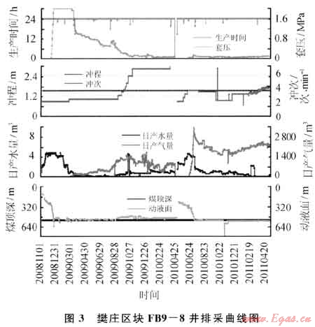 FB9-8井于2006年8月2日完鉆,完鉆井深585m。2008年6月27日壓裂3#煤層,壓裂井段523.8~528.8 m,厚度5.0 m,共注入活性水壓裂液356m3,石英砂30m3。2008年11月7日投產(chǎn),排采40d解吸見(jiàn)氣,最高日產(chǎn)氣量達(dá)到1746m3,產(chǎn)氣高峰時(shí)日產(chǎn)水0.8m3,維持138 d后日產(chǎn)氣量迅速下降至466m3,水量0.1m3。判斷為地層氣鎖及地層應(yīng)力閉合雙重影響,導(dǎo)致產(chǎn)量下降(圖3)。2010年5月1日進(jìn)行大規(guī)模壓裂解堵,措施后65d,產(chǎn)氣量增加至2400m3,截至目前已穩(wěn)產(chǎn)312d,累計(jì)增產(chǎn)氣約54×104m3。