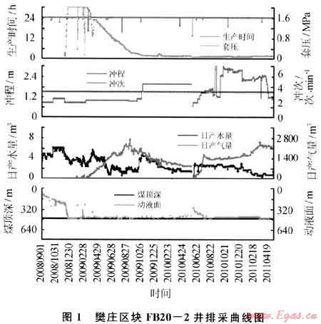 FB20-2井于2007年4月10日完鉆,完鉆井深520m。2008年6月25日壓裂3#煤,壓裂井段457.3~462.7m,厚度5.4m,共注入活性水壓裂液446m3,石英砂40m3。2008年9月4日投產(chǎn),排采98d解吸見(jiàn)氣,最高日產(chǎn)氣量達(dá)到2644m3,產(chǎn)氣高峰時(shí)日產(chǎn)水1.9m3,維持90d后產(chǎn)氣量迅速下降至813m3,水量1.4m3。判斷為粉煤灰堵塞地層通道,導(dǎo)致產(chǎn)量下降。2010年6月5日進(jìn)行小規(guī)模壓裂解堵,措施后279d,產(chǎn)氣量增加至2200m3,截至目前已穩(wěn)產(chǎn)75d(圖1),已累計(jì)增產(chǎn)氣15×104m3。