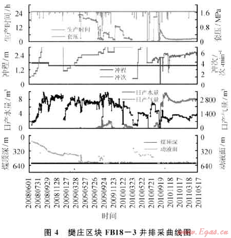 FB18-3井于2007年5月12日完鉆,完鉆井深650m。2008年6月6日壓裂3#煤層,壓裂井段587.9~592.5m,厚度4.6m,共注入清潔壓裂液246m3,石英砂30m3。2008年6月21日投產(chǎn),排采301d解吸見(jiàn)氣,最高日產(chǎn)氣量達(dá)到1226m3,產(chǎn)氣高峰時(shí)日產(chǎn)水16.2m3,維持30 d后產(chǎn)氣量迅速下降至87m3,水量11.5m3。判斷為首次壓裂效果差,導(dǎo)致見(jiàn)氣后套壓迅速下降,降壓范圍難以擴(kuò)展(圖4)。2010年3月27日進(jìn)行二次壓裂,措施后168d,產(chǎn)量增加至2632m3,目前已穩(wěn)產(chǎn)238d,累計(jì)增產(chǎn)氣59×104m3。