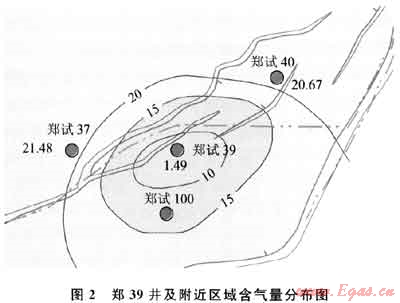 斷層(“陷落柱”)的作用一是對附近煤層氣有解吸作用,封堵性差可造成煤層含氣量低,但解吸范圍有限,例如鄭試39井位于斷裂帶內(nèi)(圖2),含氣量僅2.5m3/t,主要由于斷層、“陷落柱”煤層氣很快逸散,造成含氣量低;二是近斷層地帶裂縫發(fā)育,通過壓裂易與斷層、地層水或地表水溝通,煤層氣沿裂縫逸散,排采井可能產(chǎn)水量大、產(chǎn)氣量較小或不產(chǎn)氣[5]。
