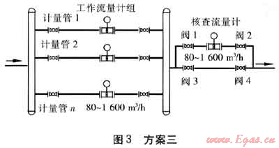 上述方案二中的流量計(jì)1和流量計(jì)2可以串聯(lián)達(dá)到互相核查的目的,但在更多流量計(jì)并聯(lián)組成的計(jì)量系統(tǒng)中就需要考慮設(shè)立單獨(dú)的核查流量計(jì)。如圖3,方案三中有工作流量計(jì)n臺(tái),每臺(tái)流量計(jì)的測(cè)量范圍是80~1600m3/h,系統(tǒng)的測(cè)量范圍是(80~1600)n m3/h。核查流量計(jì)是一臺(tái)80~1600m3/h的流量計(jì)。正常工作時(shí),工作流量計(jì)根據(jù)供氣量,可以運(yùn)行在不同的開備組合下,核查流量計(jì)前后閥門1和閥門2關(guān)閉,閥門3和閥門4開啟,核查流量計(jì)不投入運(yùn)行。需要對(duì)工作流量計(jì)進(jìn)行核查比對(duì)時(shí),閥門1和閥門2開啟,閥門3和閥門4關(guān)閉,核查流量計(jì)投入運(yùn)行。通過閥門開閉,任何一臺(tái)工作流量計(jì)都可以和核查流量計(jì)形成串聯(lián)運(yùn)行,進(jìn)行核查比對(duì)。