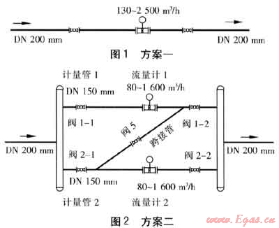圖1、2為某城市天然氣門站計(jì)量系統(tǒng)工藝管路方案一和方案二。兩個(gè)方案相比較,方案一結(jié)構(gòu)簡(jiǎn)單,工程造價(jià)較低,方案二則相反。但是,采用兩管并聯(lián)的方案二,可以使整個(gè)計(jì)量系統(tǒng)的測(cè)量范圍從130~2500m3/h(量程比20:1)擴(kuò)展到80~3200m3/h(量程比40:1)。在門站運(yùn)行過程中,如果遇到流量波動(dòng)較大時(shí),方案二可以隨時(shí)打開或關(guān)閉兩臺(tái)流量計(jì)中的一臺(tái),使流量計(jì)量?jī)x表始終工作在0.2qmax到0.8qmax這一計(jì)量性能最優(yōu)的范圍段(qmax為最大流量),從而保證整個(gè)計(jì)量系統(tǒng)的計(jì)量性能最優(yōu)。另外在流量計(jì)1或流量計(jì)2中的某一臺(tái)出現(xiàn)故障或進(jìn)行周期檢定時(shí),可以使用單臺(tái)流量計(jì)供氣運(yùn)行的方式,避免城市門站供氣中斷的情況發(fā)生。