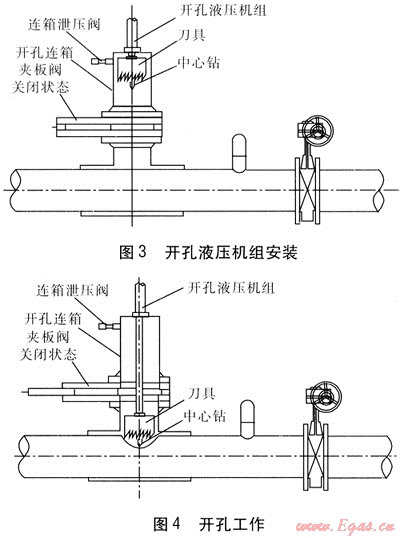 由于此次事故點(diǎn)位于支線閥門前端,且施工空間有限,事故又發(fā)生在供熱初期,經(jīng)我們研究確定,在不影響干線運(yùn)行的同時(shí),關(guān)閉支線閥門,對支線暫時(shí)停熱,采用單孔帶壓開孔封堵技術(shù),利用支線閥門及塞堵板將旁通管封閉后拆除。這樣,既能節(jié)省資金又能將管內(nèi)流體流速降至最低,更進(jìn)一步保證開孔工作的安全性。