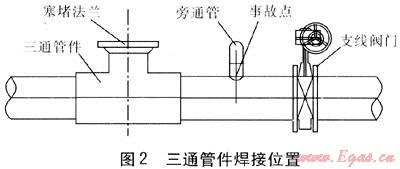 在焊接前檢查三通管件的幾何尺寸,是否與供水支線相符,管件自身焊口是否達(dá)到要求。確定開孔位置后,清除管道防腐層,將三通管件焊接在支線上(見圖2)。三通管件分上下兩部分,相對組焊在支線管道上,并焊接兩道環(huán)向焊縫。組焊時(shí)要求管件與管道同軸、塞堵法蘭面與管道軸線平行,法蘭中心線與管道軸線垂直,管件焊接按相關(guān)標(biāo)準(zhǔn)進(jìn)行。本步操作由于不與管內(nèi)供熱介質(zhì)直接接觸,不存在安全隱患。