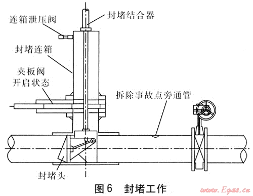 將封堵結(jié)合器、封堵頭、封堵連箱按所需規(guī)格選配組裝在一起,并測量計(jì)算出封堵就位時(shí)的各種數(shù)據(jù),確定封堵方向。把組裝好的封堵器安裝到夾板閥上(見圖5),先確定封堵方向無誤后,打開夾板閥,并關(guān)閉支線閥門,進(jìn)行封堵作業(yè)(見圖6)。封堵后,打開連箱泄壓閥對管道內(nèi)供熱介質(zhì)進(jìn)行放空,并確認(rèn)封堵的嚴(yán)密性。檢驗(yàn)完畢后,對事故點(diǎn)旁通管進(jìn)行拆除并采用鋼板焊接封堵。焊接完成后將封堵頭松開并提入封堵連箱內(nèi),關(guān)閉夾板閥,拆下封堵器,封堵作業(yè)結(jié)束。