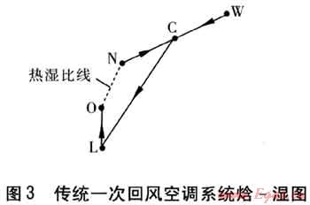 一次回風(fēng)空調(diào)系統(tǒng)焓一濕圖見(jiàn)3。狀態(tài)W的室外新風(fēng)與狀態(tài)N的室內(nèi)回風(fēng)混合處理到狀態(tài)C,經(jīng)過(guò)表冷器冷卻除濕到狀態(tài)L(機(jī)器露點(diǎn)),然后經(jīng)過(guò)電加熱器加熱到送風(fēng)狀態(tài)0送入房間,吸收房間余熱余濕,沿?zé)釢癖染€到狀態(tài)N。一次回風(fēng)空調(diào)系統(tǒng)的主要缺點(diǎn)是:被處理空氣先冷卻后再熱,存在冷熱抵消問(wèn)題;表冷器在濕工況下工作,需要溫度較低的冷源。