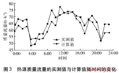 熱源質(zhì)量流量的實(shí)測(cè)值與計(jì)算值隨時(shí)間的變化見(jiàn)圖3。由圖3可知,除9:00和17:00偏差較大外,其余時(shí)刻相對(duì)誤差均在±10%以內(nèi),全天質(zhì)量流量的計(jì)算值與實(shí)測(cè)值的平均相對(duì)誤差為-4.1%。由于9:00與17:00為上、下班時(shí)間,管網(wǎng)流量波動(dòng)較大,系統(tǒng)處于非穩(wěn)態(tài),因此計(jì)算值與實(shí)測(cè)值偏差較大。
