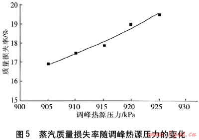調(diào)峰熱源的主要作用是調(diào)峰,必須合理調(diào)節(jié)調(diào)峰熱源壓力以保證供汽壓力。采用10:00用戶質(zhì)量流量實(shí)測(cè)值與熱源壓力實(shí)測(cè)值計(jì)算調(diào)峰熱源出口壓力降低對(duì)管網(wǎng)運(yùn)行狀況的影響。主熱源出口壓力保持928kPa,調(diào)峰熱源壓力由實(shí)際的925kPa降低至能夠滿足末端用戶壓力的905kPa,用戶流量不變。蒸汽質(zhì)量損失率隨調(diào)峰熱源壓力的變化見(jiàn)圖5。