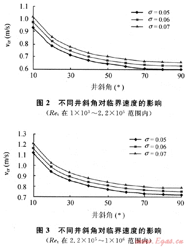 計算液滴在井筒氣流中的臨界速度可用試差法。根據(jù)式(11)和式(12)計算臨界速度(vcr)時,需要預先知道雷諾數(shù)(Ret)的取值范圍才能選用相應的計算式。但是,vcr為待求,Ret值也就未知。所以,vcr的計算需要用試差法。即:先假設Ret的取值范圍為1×103~2.2×105或2.2×105~1×106,可以直接選用于該流型相一致的臨界速度計算公式,然后按求出的%來檢驗Ret值是否在假設的范圍內。如果與假設一致,則求得的vcr有效;否則,按算出的Ret值另選公式,直到按求的vcr,算出的Ret值恰與所選用公式的Ret取值范圍相符為止。