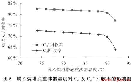 脫乙烷塔底重沸器溫度對C3及C3+回收率的影響如圖5所示。從圖5可知,隨著脫乙烷塔底重沸器溫度的升高,C3及C3+回收率隨之緩慢下降,但當(dāng)溫度達到90℃時回收率會加速下降。