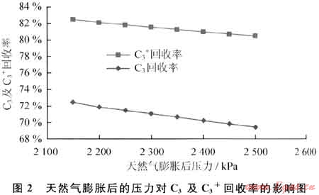 天然氣經(jīng)膨脹機組膨脹后的壓力對C3及C3+回收率的影響如圖2所示。