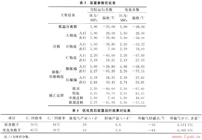對原裝置在不作重大改造的前提下,利用HYSYS軟件對實際工藝過程進行優(yōu)化,以得到較高的C3及C3+回收率。裝置參數(shù)優(yōu)化情況見表3,參數(shù)優(yōu)化前后裝置運行效果對比情況見表4。