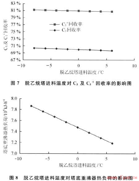 脫乙烷塔的進料溫度對C3及C3+回收率和塔底重沸器熱負荷的影響如圖7、8所示。從圖7、8可以看出,隨著進料溫度增加,C3及C3+回收率下降,塔底重沸器的熱負荷也隨之降低。這是因為進料溫度增加,帶入了更多的熱量,從而使再沸器熱負荷減少。因脫乙烷塔塔頂沒有冷凝器,在進料帶入更多熱量后,脫乙烷塔塔頂溫度升高,部分C3及C3+被帶走,導(dǎo)致C3及C3+回收率下降。