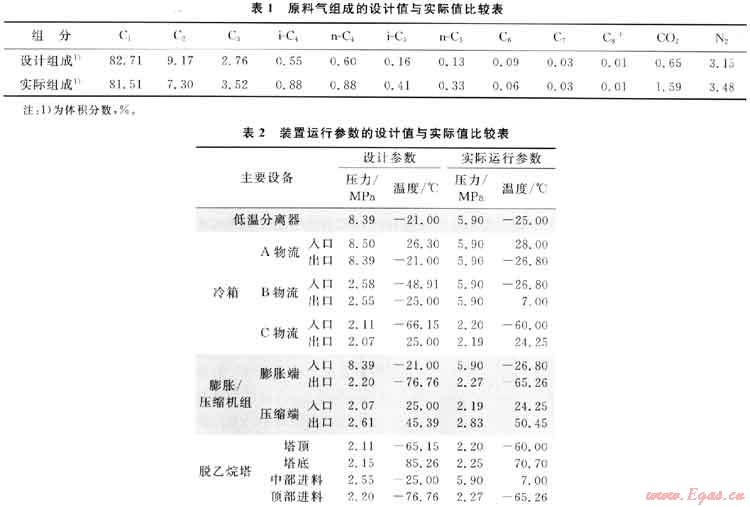 對比凝析氣處理裝置的天然氣的組成及裝置運行參數(shù)的設(shè)計值與實際值,可知原料氣的組成有所變化,天然氣變富,天然氣的處理量明顯增加,進氣壓力降低且生產(chǎn)裝置的運行參數(shù)也與設(shè)計參數(shù)有一定偏差。