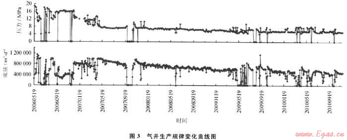 氣井井口流量變化可分為3個(gè)階段:①投產(chǎn)初期(一年內(nèi))井口流量變化范圍較大,生產(chǎn)不穩(wěn)定,產(chǎn)氣量為(20~120)×104m3/d;②投產(chǎn)第二年和第三年,生產(chǎn)較為穩(wěn)定,產(chǎn)氣量為(20~80)×104m3/d;③從投產(chǎn)第四年至今,產(chǎn)氣量穩(wěn)定在(15~60)×104m3/d。