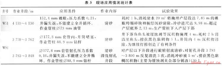 水力旋轉(zhuǎn)射流清砂技術(shù)在井漏失返不能建立全井循環(huán)、其他清砂技術(shù)無法實施的2口井進行了3井次的現(xiàn)場應(yīng)用,成功恢復(fù)2口井產(chǎn)能,取得了很好的應(yīng)用效果(表3)。